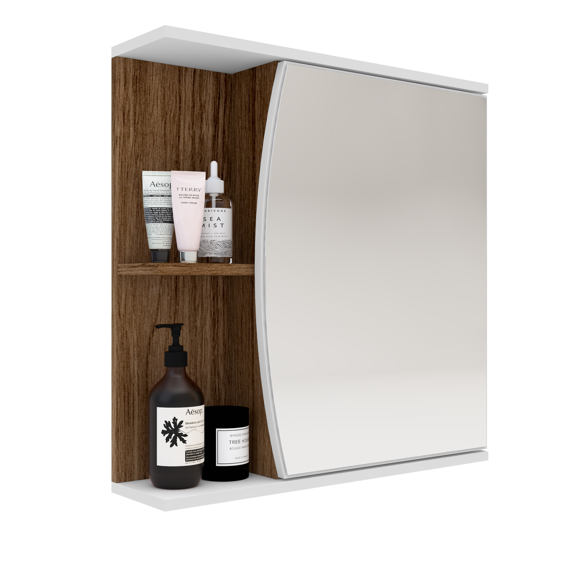 Espelho de banheiro com 1 prateleira e 1 porta.